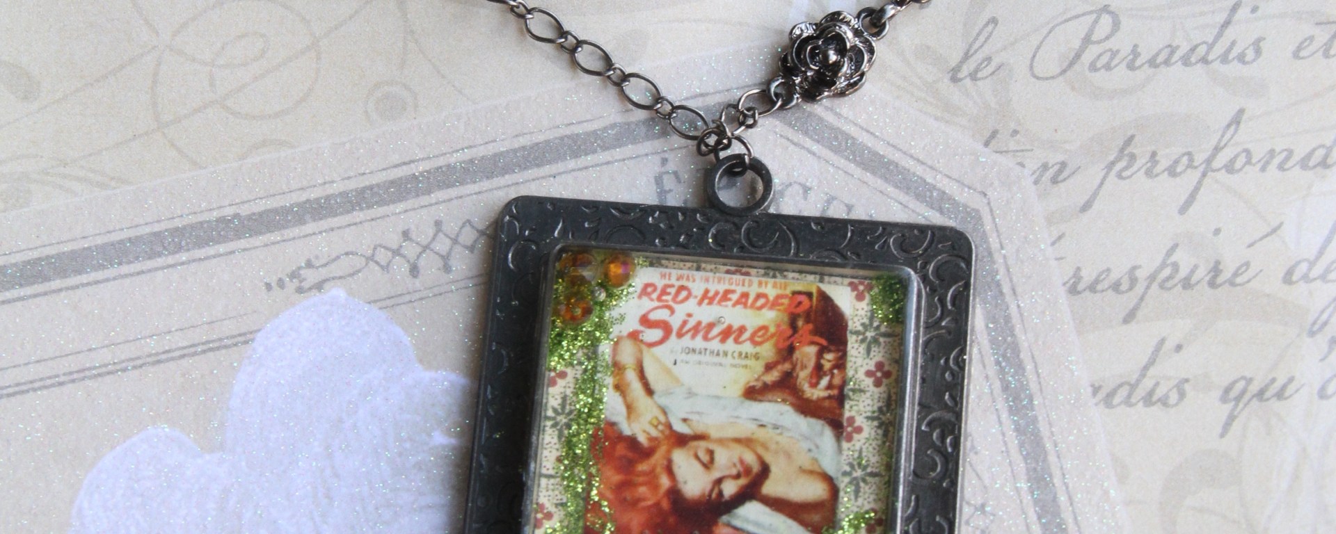 I’ve been working on various jewelry pieces using techniques that I learned in 2015, including metalsmithing, polymer clay, and ice resin. This is an example of the latter of the three: a vintage 1950s image from a trashy romance novel entitled Red-Headed Sinner. I’ve named my piece without the hyphen (because that is grammatically correct in modern times). The image is copyright-free in a collage, then placed in a bezel with beads and glitter, and encased in ice resin. I then added the metal leaf finding at the bottom, and used various metal and dark green beads in the chain.